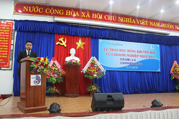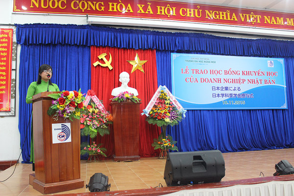 Đại diện cho 22 sinh viên nhận học bổng đợt này, sinh viên Hà Xuân Thảo lớp 12CNJ03 (ngành tiếng Nhật thuộc Khoa Nhật – Hàn – Thái) vui mừng chia sẻ: “Em thật sự rất vinh dự và lấy làm biết ơn, khi các doanh nghiệp Nhật Bản tại Đà Nẵng, cũng như các doanh nghiệp Nhật Bản tại Nhật đã quyết định trao học bổng cho các bạn sinh viên tổ Tiếng Nhật trường Đại học Ngoại ngữ. Thay mặt 22 bạn sinh viên, em xin gửi lời cảm ơn chân thành đến các doanh nghiệp có mặt trong buổi lễ ngày hôm nay. Chúng em mỗi người đều có một hoàn cảnh riêng, nhưng có một điểm chung rằng chúng em luôn luôn cố gắng, phấn đấu trong việc học tiếng Nhật. Có thể nhận được học bổng quý giá ngày hôm nay, thật sự là một nguồn cổ vũ động viên có ý nghĩa to lớn với chúng em. Nó không chỉ giúp chúng em trang trải một phần gánh nặng kinh tế, mà đó còn là sự khích lệ, động lực mạnh mẽ giúp chúng em cố gắng hơn nữa trên con đường học tập. Hơn nữa, em tin rằng vinh dự nhận được học bổng lần này cũng là cơ hội để chúng em có thể giao lưu, tiếp xúc với các doanh nghiệp Nhật Bản. Trong số chúng em, sau khi tốt nghiệp, sẽ có những bạn học tiếp, những bạn sẽ bắt đầu đi làm ở các công ty Nhật Bản. Cho dù tiến bước trên con đường nào, chúng em cũng sẽ phát huy những điều quý giá mà chúng em đã học, mang trong mình trách nhiệm của một người trưởng thành, em hy vọng sẽ cống hiến hết mình cho sự phát triển của Nhật Bản và Việt Nam.”