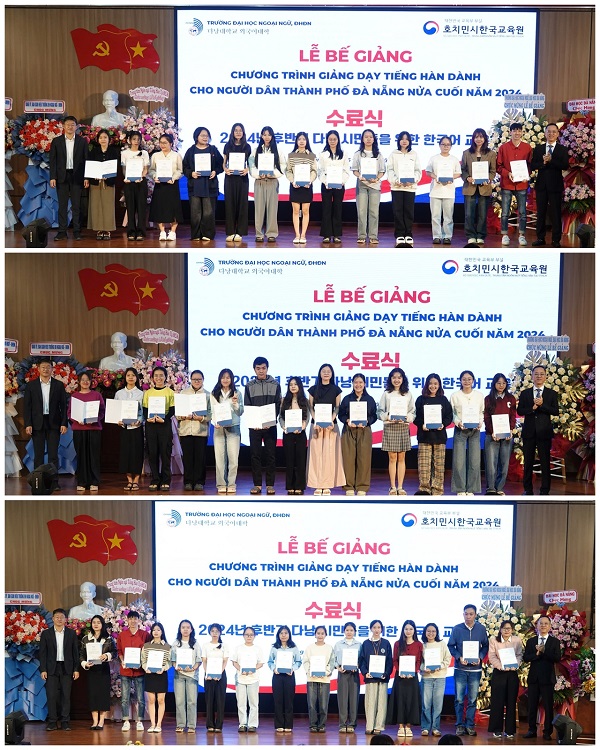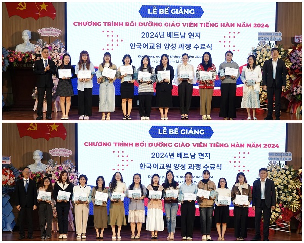 Tại Lễ Bế giảng, Nhà trường đã trao chứng nhận cho 28 học viên đã hoàn thành Khóa Bồi dưỡng giáo viên tiếng Hàn năm 2024 cũng như các học viên đã hoàn thành Khóa Giảng dạy tiếng Hàn đặc biệt dành cho người dân thành phố Đà Nẵng.