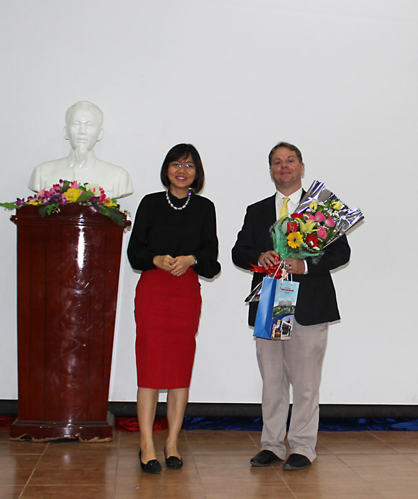 ThS. Lê Thị Phương Loan – Phó Trưởng khoa Quốc tế học tặng hoa cho báo cáo viên Nathan Lauer, Giám đốc Kinh doanh và Tiếp thị Công ty Vinahouse Space, tình nguyện viên văn hóa của Bảo tàng Chăm Đà Nẵng.