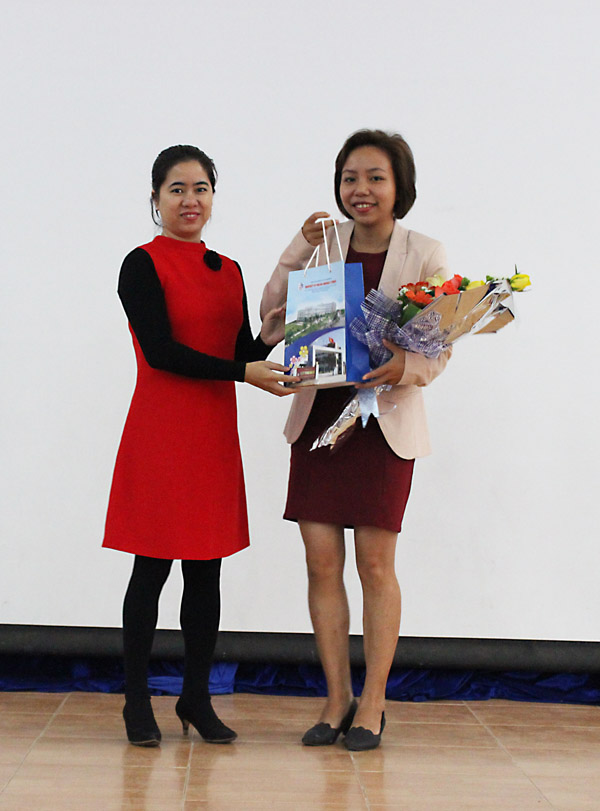 ThS. Lê Thị Kim Oanh – Phó Trưởng khoa Quốc tế học tặng hoa cho báo cáo viên Lê Hoàng Hạnh, đại diện Công ty TNHH Mặt trời Đông Dương.