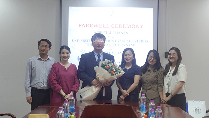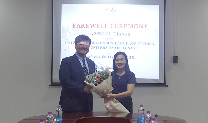 Đến Đà Nẵng vào ngày 4/1/2024, giáo sư Im Hyeon-yeol đã triển khai công tác nghiên cứu thực địa của mình tại Trường Đại học Ngoại ngữ. Với đề tài nghiên cứu liên quan đến vai trò của chữ Hán trong đời sống ngôn ngữ ở những nước từng nằm trong vùng ảnh hưởng của chữ Hán, giáo sư Im Hyeon-yeol đã thăm và làm việc với giảng viên và sinh viên của Khoa Ngôn ngữ và Văn hóa Hàn Quốc, phỏng vấn cùng giảng viên Khoa Tiếng Trung… Tại buổi chia tay, TS. Huỳnh Ngọc Mai Kha đã đánh giá cao hoạt động nghiên cứu của giáo sư Im Hyeon-yeol và gửi lời chúc cho những thành công của giáo sư trong các hoạt động chuyên môn học thuật. Giáo sư Im Hyeon- yeol tỏ lòng biết ơn tới sự hỗ trợ của Trường Đại học Ngoại ngữ nói chung, Khoa Ngôn ngữ & Văn hoá Hàn Quốc nói riêng trong hoạt động nghiên cứu của bản thân. TS. Huỳnh Ngọc Mai Kha tặng hoa và quà lưu niệm cho giáo sư Im Hyeon-yeol, bày tỏ lòng tri ân và chúc cho mối quan hệ hợp tác giữa hai trường ngày càng phát triển.
