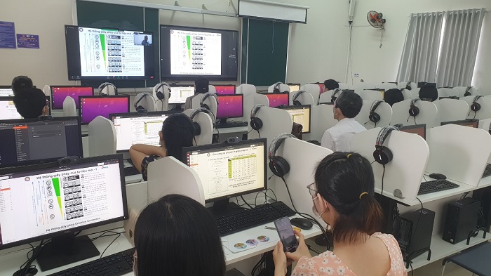 Sinh viên Trường ĐH Ngoại ngữ, ĐH Đà Nẵng thực hành tại phòng học đa phương tiện.