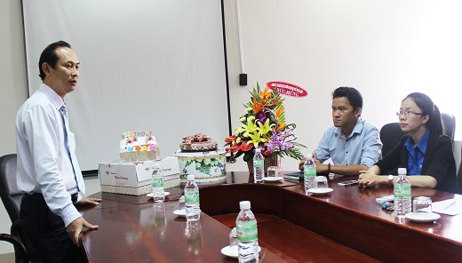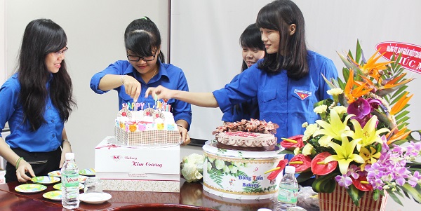 Cắt bánh kem mừng sinh nhật Đoàn.