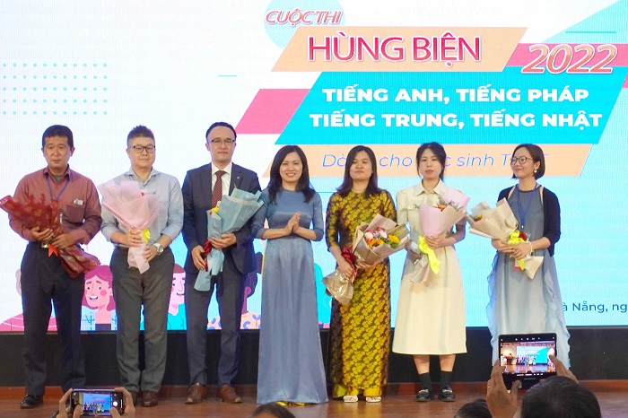 Ông Mai Tấn Linh – Phó Giám đốc Sở Giáo dục và Đào tạo thành phố Đà Nẵng, Phó Trưởng Ban Tổ chức trao hoa cảm ơn các Ban Giám khảo Bảng tiếng Anh và tiếng Pháp