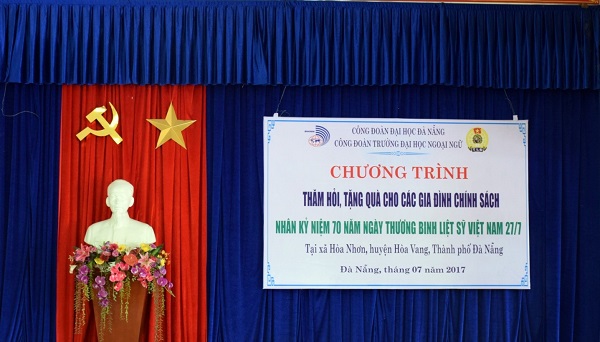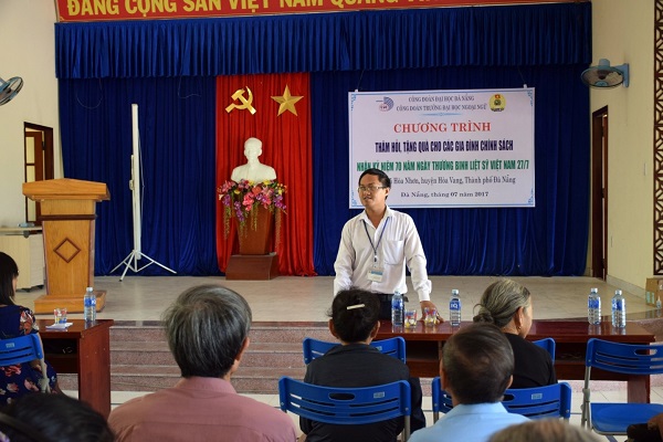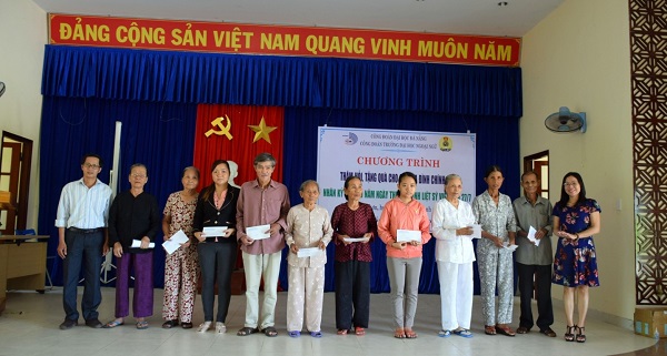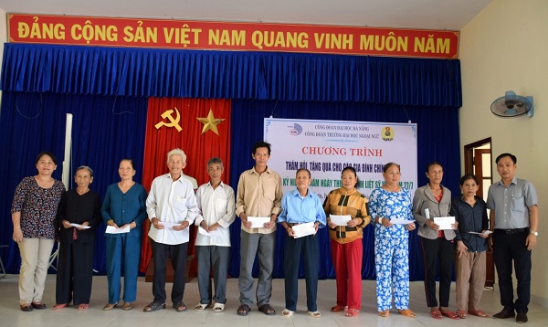 Để thể hiện lòng biết ơn, hàng năm, tập thể CBGV-NLĐ trường Đại học Ngoại ngữ luôn có nhiều việc làm thiết thực để thực hiện chính sách đền ơn đáp nghĩa. Năm nay, tiếp nối truyền thống “uống nước nhớ nguồn” tốt đẹp này, đồng thời cũng nhằm thực hiện chương trình giúp đỡ huyện Hòa Vang xây dựng nông thôn mới theo tinh thần chỉ đạo của Thành ủy TP. Đà Nẵng và Đảng bộ Đại học Đà nẵng, Công đoàn Trường Đại học Ngoại ngữ đã tổ chức buổi thăm hỏi và tặng quà cho 30 hộ gia đình chính sách thuộc xã Hòa Nhơn, huyện Hòa Vang, TP. Đà Nẵng. Mỗi phần quà trị giá 500.000 đồng, tuy món quà không lớn nhưng thể hiện tấm lòng của tập thể đoàn viên công đoàn Trường Đại học Ngoại ngữ mong muốn hỗ trợ giúp đỡ được một phần nào đó cho cuộc sống khó khăn của các hộ gia đình chính sách của xã Hòa Nhơn nói riêng và huyện Hòa Vang nói chung.
