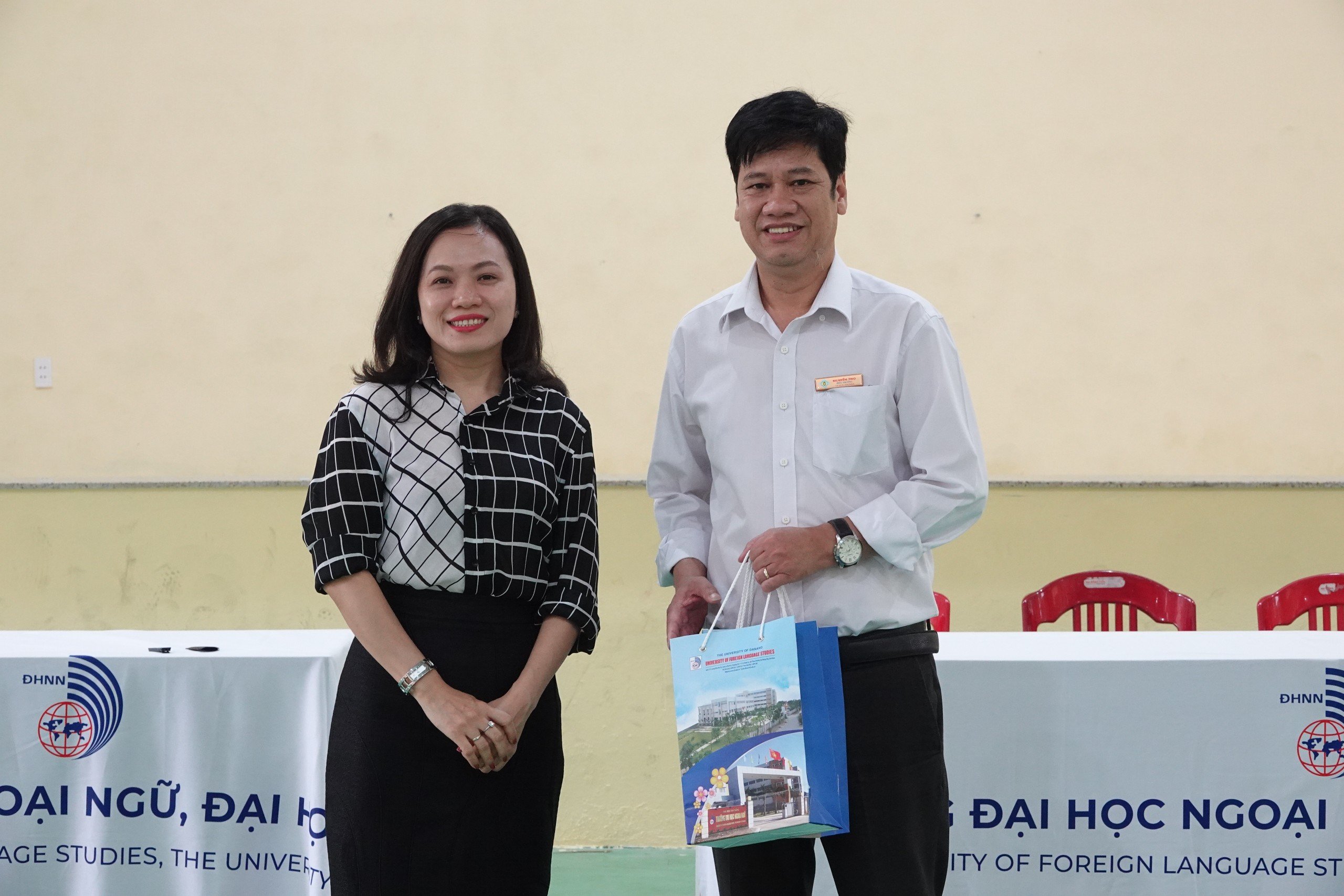 Đại diện lãnh đạo Trường Đại học Ngoại ngữ, ĐHĐN tặng quà lưu niệm cho đại diện Ban Giám hiệu Trường THPT Chu Văn An, Quảng Trị
