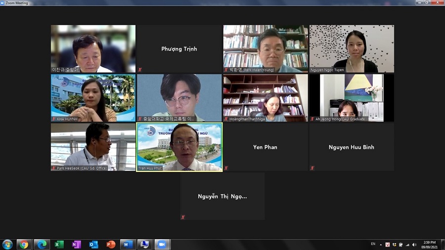 Về phía Đại học Chung-Ang, tham gia buổi trao đổi trực tuyến có Giáo sư Lee Chan Kyu, Nguyên Phó giám đốc cùng các Thầy, Cô là đại diện lãnh đạo Đại học Chung-Ang. Về phía Trường Đại học Ngoại ngữ – ĐHĐN, có PGS. TS. Trần Hữu Phúc – Hiệu trưởng, TS. Huỳnh Ngọc Mai Kha – Phó Hiệu trưởng cùng đại diện lãnh đạo Phòng Khoa học và Hợp tác Quốc tế, Phòng Đào tạo, Phòng Kế hoạch -Tài chính và Khoa tiếng Nhật-Hàn -Thái.