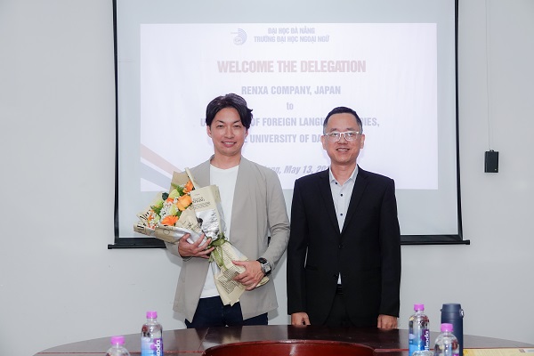 TS. Nguyễn Hữu Bình – Phó hiệu trưởng Trường Đại học Ngoại ngữ tặng hoa lưu niệm cho đại diện Công ty Renxa, Nhật Bản
