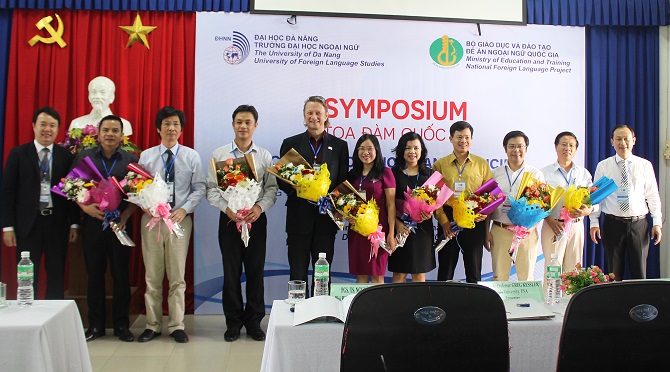 Lãnh đạo Trường và Ban Quản lý Đề án NNQG tặng hoa các báo cáo viên tại Tọa đàm Quốc tế: “Ứng dụng công nghệ thông tin và những định hướng mới trong dạy và học ngoại ngữ ở khu vực và quốc tế”