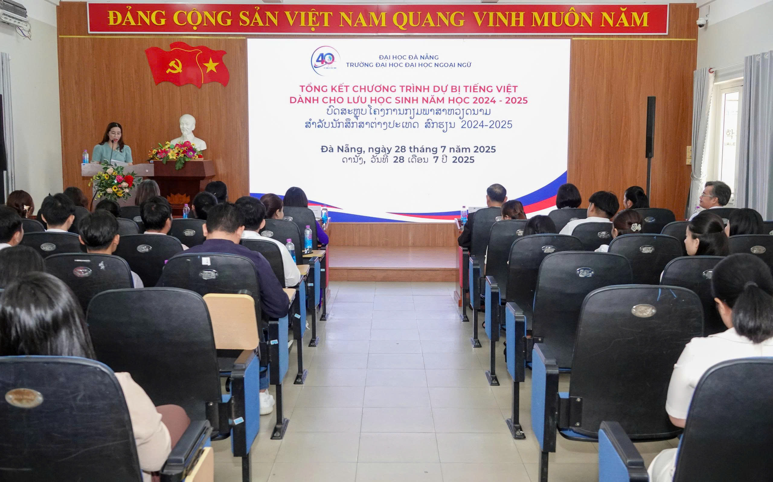 Tham dự buổi lễ, PGS.TS. Khanthaly Khamphilavong – Bí thư thứ nhất Phòng Giáo dục và Văn hóa, Tổng Lãnh sự quán Lào tại Đà Nẵng bày tỏ niềm vui và xúc động khi chứng kiến sự trưởng thành của các lưu học sinh. Ông chia sẻ trải nghiệm của chính mình khi học tiếng Việt, nhấn mạnh rằng học ngôn ngữ là con đường để hiểu sâu sắc văn hóa và con người Việt Nam.