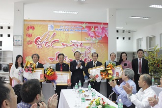TS. Trần Hữu Phúc lên tặng hoa và quà chúc mừng PGS.TS. Phan Văn Hòa, PGS.TS. Dương Quốc Cường, PGS.TS. Lưu Quý Khương, PGS.TS. Nguyễn Ngọc Chinh được Chủ tịch nước phong tặng danh hiệu cao quý Nhà giáo ưu tú