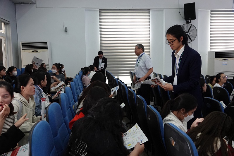 Tiếp đón đoàn có TS. Huỳnh Ngọc Mai Kha – Phó Hiệu trưởng, đại diện Lãnh đạo Khoa Ngôn ngữ & Văn hóa Nhật Bản, đại diện các Khoa, Phòng. Về phía đoàn Nhật Bản, ông Aoki Hiromi – Giám đốc đại diện điều hành Công ty cổ phần Suntech kiêm Chủ tịch Hội Hỗ trợ Sinh viên Quốc tế tỉnh Kagawa – Học viện Anabuki dẫn đầu đoàn doanh nghiệp.