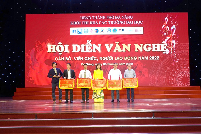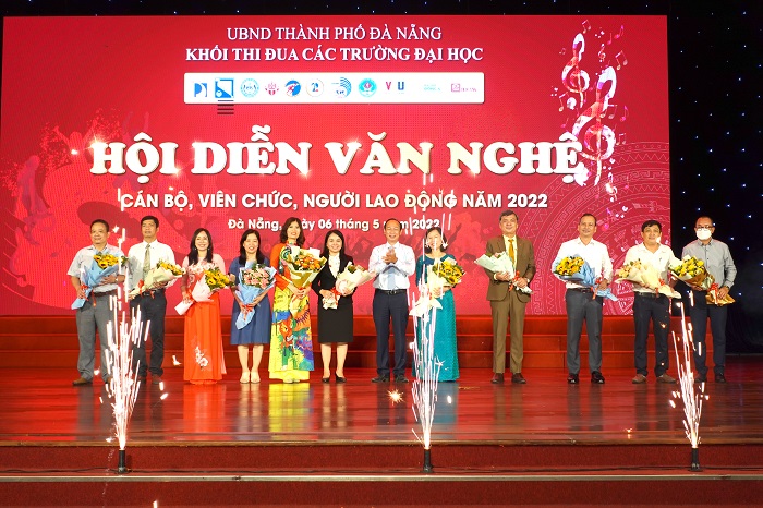 PGS. TS. Trần Hữu Phúc, Khối trưởng Khối thi đua các trường đại học tại thành phố Đà Nẵng năm học 2021-2022, Hiệu trưởng Trường Đại học Ngoại ngữ – ĐHĐN tặng hoa chúc mừng các đội văn nghệ của các trường.