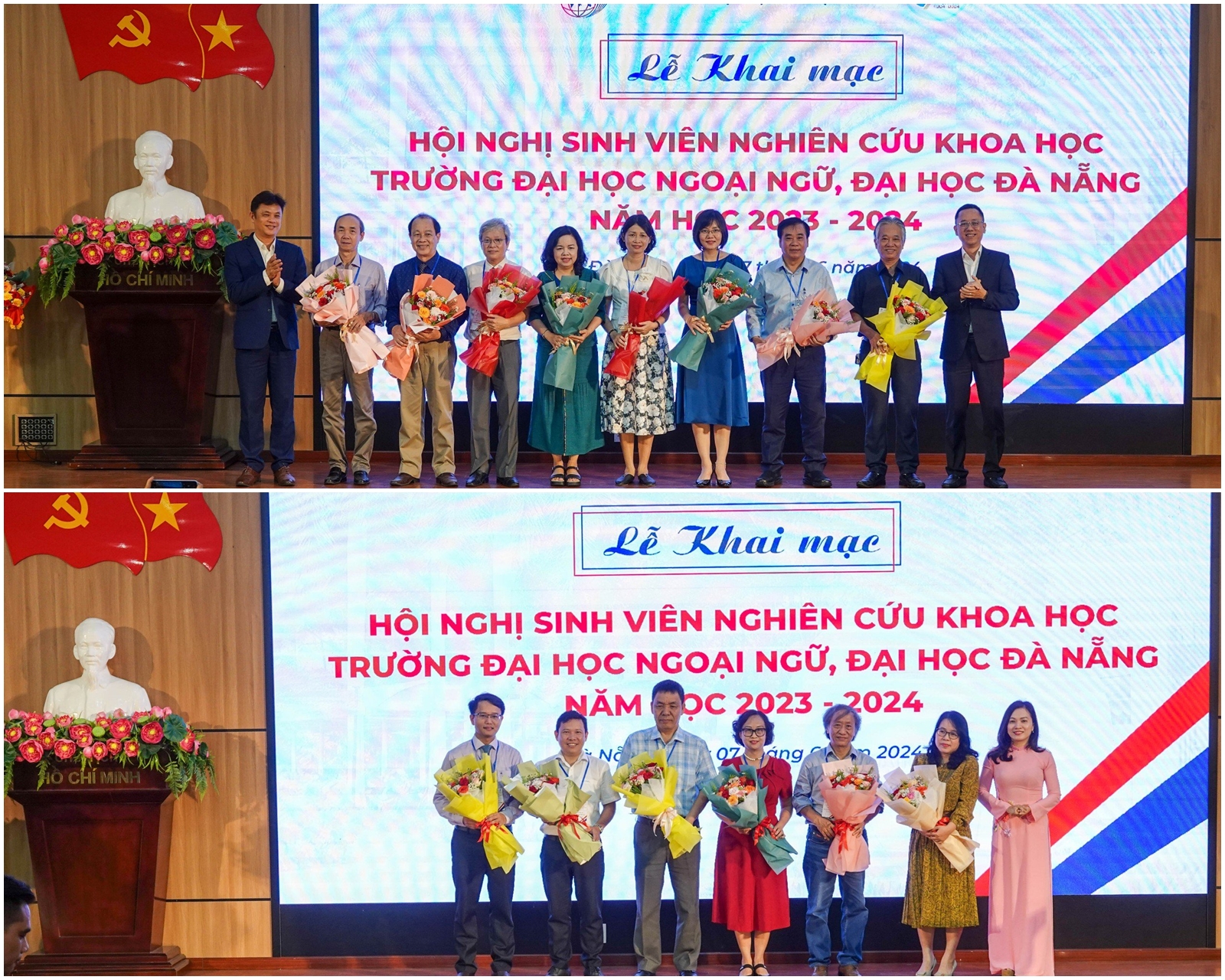 Đại diện Ban Giám hiệu Trường Đại học Ngoại ngữ, ĐHĐN tặng hoa cho các Thầy, Cô là Trưởng Tiểu ban tại Hội nghị