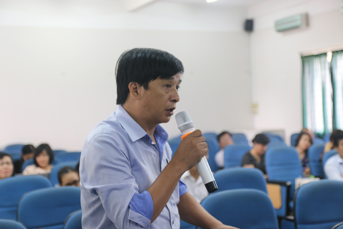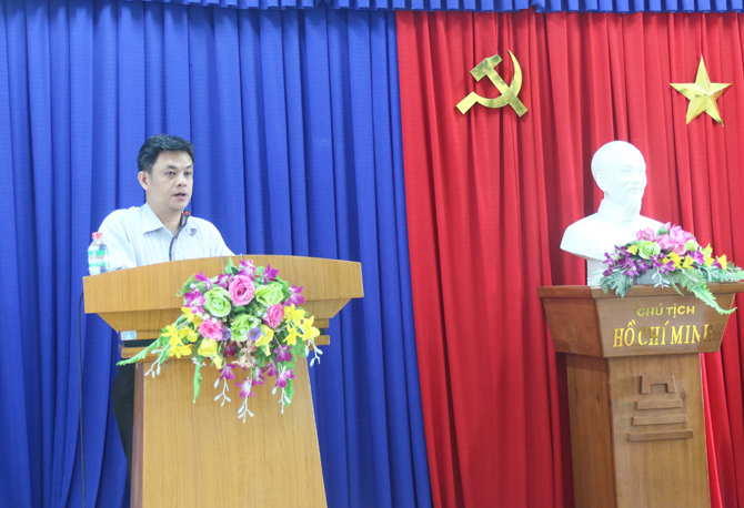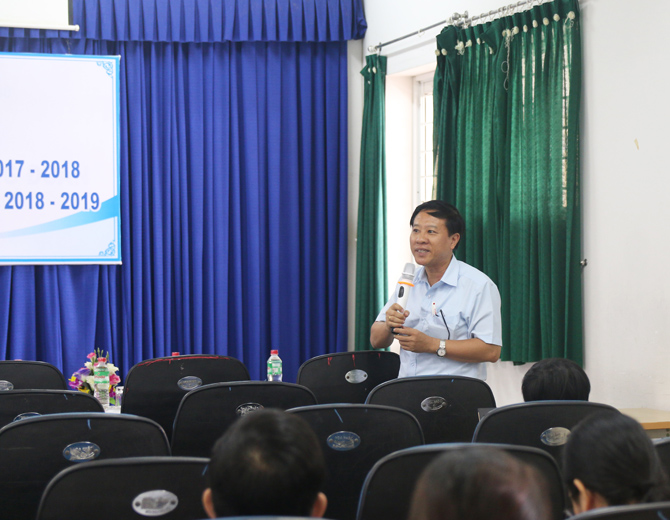 PGS.TS. Dương Quốc Cường – Phó Hiệu trưởng trình bày báo cáo công tác đào tạo VLVH, công tác sinh viên, pháp chế, thanh tra, thi đua khen thưởng