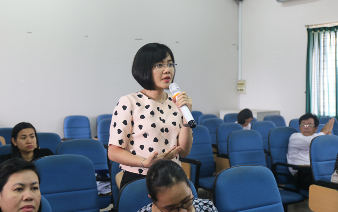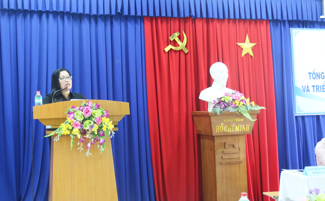 TS. Đào Thị Thanh Phượng, Phó Hiệu trưởng trình bày báo cáo công tác khoa học, hợp tác quốc tế, liên kết đào tạo quốc tế