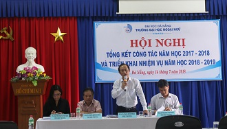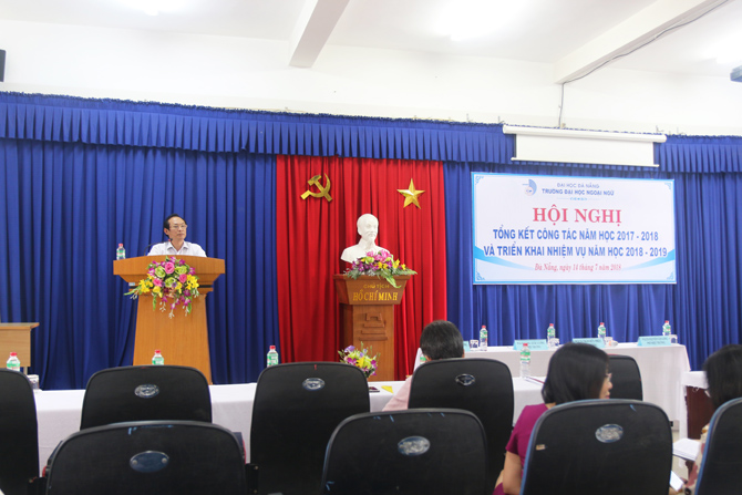 PGS.TS. Nguyễn Văn Long trình bày báo cáo tổng kết công tác đào tạo chính quy, sau đại học, đề án NNQG 2020, khảo thí và đảm bảo chất lượng giáo dục.