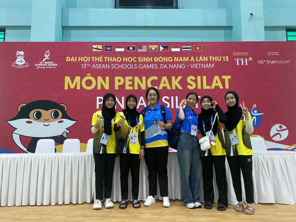 Sinh viên Phùng Diệu Hương (thứ ba từ trái sang) chụp ảnh lưu niệm cùng các vận động viên Pencaksilat đến từ Brunei tại Đại hội Thể thao học sinh Đông Nam Á