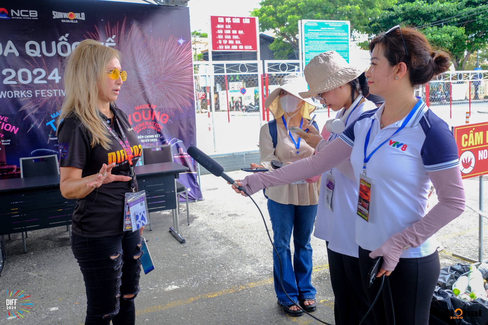 Sinh viên Lưu Ngọc Bảo Thi (thứ hai từ phải sang, đội mũ và đang ghi chép) hỗ trợ phiên dịch nhà sản xuất trong công tác truyền thông, phỏng vấn tại Lễ hội Pháo hoa quốc tế Đà Nẵng DIFF