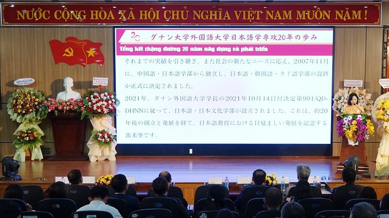 Tại Lễ kỷ niệm, TS. Nguyễn Thị Như Ý – Trưởng khoa, Khoa NN&VHNB đã tổng kết chặng đường 20 năm hình thành và phát triển ngành Ngôn ngữ Nhật, Trường Đại học Ngoại ngữ, ĐHĐN, từ những ngày đầu còn thiếu thốn về cơ sở vật chất và hạn chế về nguồn nhân lực, cho đến khi Khoa được thành lập với đội ngũ giảng viên phát triển cả về số lượng lẫn chất lượng, cùng với quy mô tuyển sinh, các ngành và chuyên ngành đào tạo ngày càng được mở rộng.