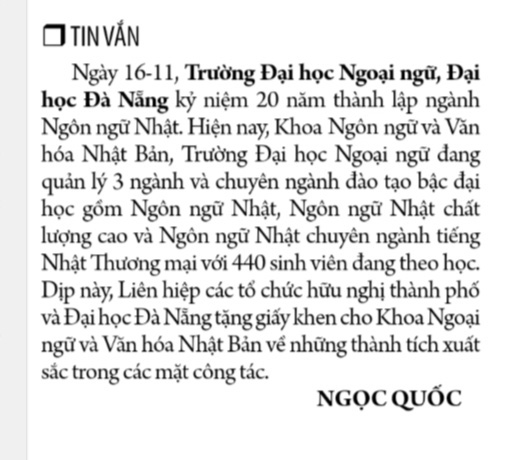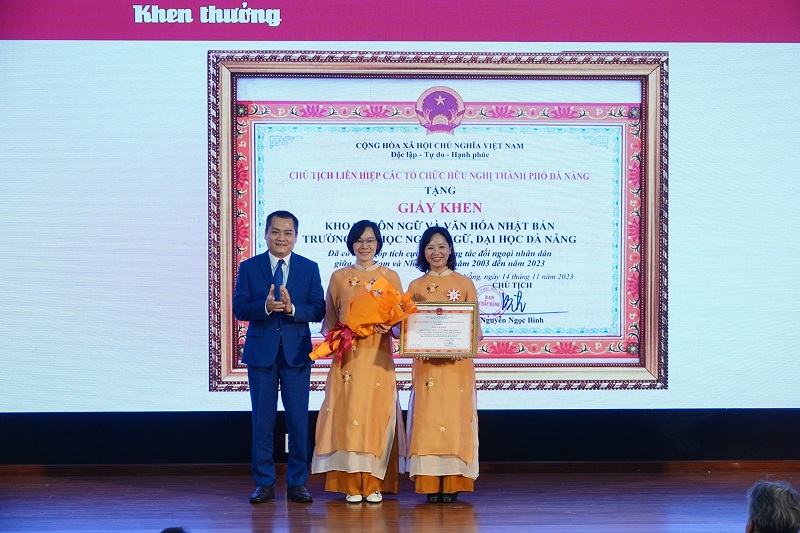 Tặng giấy khen cho khoa NN&VH Nhật Bản Trường Đại học Ngoại ngữ, Đại học Đà Nẵng vì đã có đóng góp tích cực trong công tác đối ngoại nhân dân giữa Việt Nam và Nhật Bản tử năm 2003 đến năm 2023