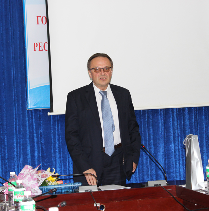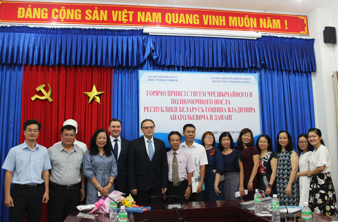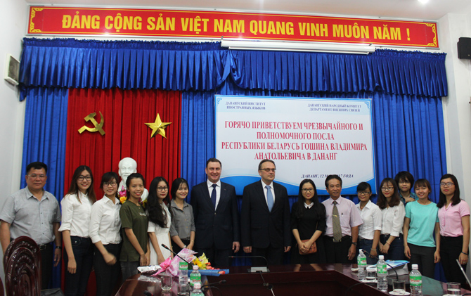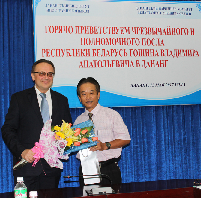 Bày tỏ sự cảm ơn về sự đón tiếp nồng hậu, Đại sứ Goshin Vladimir Anatolievich nhất trí với những vấn đề mà Thầy Phó Hiệu trưởng nêu ra và khẳng định trên cương vị công tác của mình, sẽ nỗ lực hết sức mình để tìm ra những giải pháp mở rộng hợp tác trên các lĩnh vực kinh tế, văn hóa, giáo dục, du lịch,… Ngài Đại sứ cũng tin tưởng rằng các giảng viên, sinh viên Khoa tiếng Nga sẽ là những sứ giả, góp phần thực hiện và củng cố tình hữu nghị tốt đẹp giữa Việt Nam và Cộng hòa Belarus.