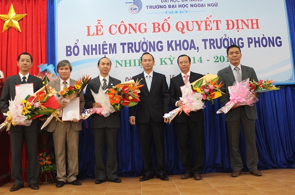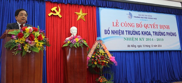 Phát biểu tại buổi lễ, PGS.TS Trần Văn Nam đã chúc mừng các Trưởng Khoa, Trưởng Phòng vừa mới được bổ nhiệm đồng thời bày tỏ mong muốn trên cương vị mới các Trưởng Khoa, Trưởng Phòng sẽ sát cánh cùng với Đảng ủy, Ban Giám hiệu và toàn thể cán bộ viên chức trong Nhà trường xây dựng Trường Đại học Ngoại ngữ không ngừng lớn mạnh, góp phần nâng cao uy tín học hiệu của Trường cũng như của Đại học Đà Nẵng lên tầm cao mới. PGS.TS Trần Văn Nam cũng đánh giá cao công tác quy hoạch và bổ nhiệm nhân sự của Đại học Ngoại ngữ trong nhiệm kỳ 2014 – 2019. Đây cũng là lần đầu tiên Trường Đại học Ngoại ngữ thực hiện bổ nhiệm nhân sự theo Quy chế Đại học vùng. “Khoa, Phòng là những hạt nhân, tế bào quan trọng nhất để thực hiện những chiến lược, chủ trương của Ban Giám hiệu Nhà trường nói riêng và Đại học Đà Nẵng nói chung. Vì vậy, việc được giao trọng trách Trưởng Khoa, Trưởng Phòng với các đồng chí vừa được bổ nhiệm là vinh dự, đồng thời cũng là trách nhiệm đòi hỏi mỗi cá nhân phải luôn nỗ lực hết mình, tận tâm cống hiến, năng động, nắm bắt kịp thời xu hướng hội nhập quốc tế để làm tốt vai trò tham mưu của mình.” – PGS. TS. Trần Văn Nam phát biểu.