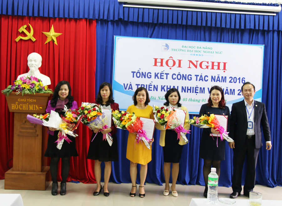 Trao Quyết định và tặng hoa chúc mừng lãnh đạo Khoa Sư Phạm Ngoại ngữ: TS. Lê Thị Giao Chi (Trưởng khoa kiêm Trưởng Bộ môn Sư phạm tiếng Anh), ThS.  Nguyễn Hữu Tâm Thu (Phó Trưởng khoa kiêm Trưởng Bộ môn Sư phạm tiếng Pháp), ThS. Đinh Thị Thủy (Phó Trưởng Khoa), ThS. Nguyễn Phạm Thanh Uyên (Phó Trưởng khoa), TS. Nguyễn Trúc Thuyên (Trưởng Bộ môn Sư phạm Tiếng Trung).