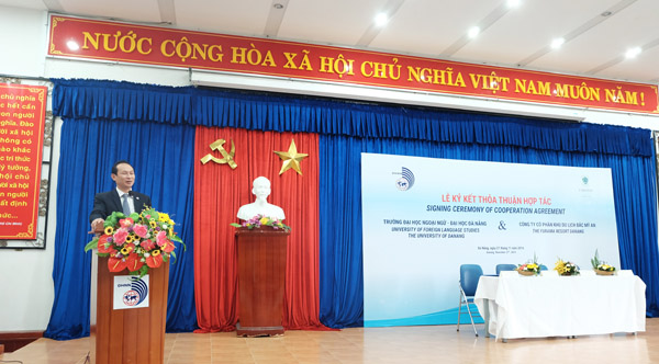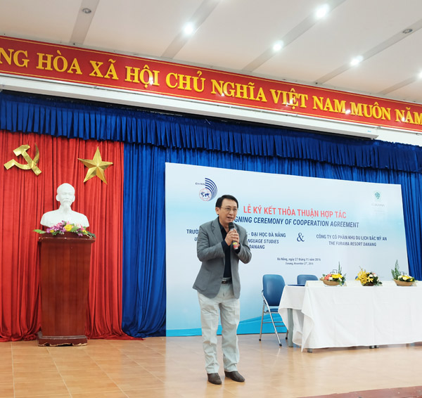 Phát biểu tại buổi lễ, TS. Trần Hữu Phúc – Hiệu trưởng Nhà trường bày tỏ niềm vinh dự khi được hợp tác cùng Furama Resort trong việc cung cấp nguồn nhân lực và tổ chức các hoạt động đào tạo. TS. Trần Hữu Phúc cho biết: Là 1 trong 3 trường đại học chuyên ngữ, Trường Đại học Ngoại ngữ – Đại học Đà Nẵng với sứ mạng đào tạo nguồn nhân lực có trình độ ngoại ngữ đáp ứng chiến lược phát triển kinh tế – xã hội của khu vực miền Trung – Tây Nguyên và cả nước vừa trở thành 1 trong 9 trường đại học đầu tiên của cả nước hoàn thành kiểm định và được công nhận đạt tiêu chuẩn chất lượng giáo dục của Bộ Giáo dục & Đào tạo. Nhà trường đào tạo đa ngành với các ngôn ngữ tiếng Anh, tiếng Pháp, tiếng Nga, tiếng Trung, tiếng Nhật, tiếng Hàn, tiếng Thái, Quốc tế học, Đông Phương học, tiếng Việt và Văn hóa Việt Nam với nhiều cấp độ từ bồi dưỡng chuyên môn, khảo sát năng lực ngoại ngữ, các chứng chỉ ngoại ngữ đến đào tạo trình độ Đại học, Thạc sĩ và Tiến sĩ. Nhà trường luôn xác định việc xây dựng và phát triển quan hệ với địa phương và doanh nghiệp là một trong những nhân tố quyết định trong việc nâng cao chất lượng đào tạo, thực hiện tốt phương châm đào tạo gắn liền với nhu cầu xã hội. Thầy khẳng định sự phát triển mạnh mẽ của Nhà trường trong chặng đường đã qua là thành quả của một tập thể thống nhất, đoàn kết từ ý chí đến hành động, là kết quả của sự miệt mài, tận tụy của thầy và trò qua các thế hệ.