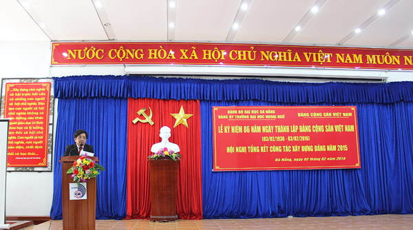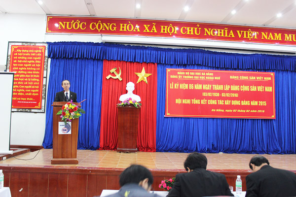 Tại Hội nghị, đồng chí Dương Quốc Cường, Phó Bí thư Đảng ủy, Phó Hiệu trưởng Nhà trường đã trình bày báo cáo tổng kết công tác xây dựng Đảng năm 2015 và phương hướng, nhiệm vụ công tác năm 2016. Theo đó, năm 2015, hoạt động của Đảng bộ luôn đảm bảo được yêu cầu quy định của Điều lệ Đảng, luôn phát huy tốt vai trò lãnh đạo, hoàn thành những chương trình, mục tiêu, nhiệm vụ đề ra trên các mặt công tác. Trong năm 2016, Đảng bộ Trường Đại học Ngoại ngữ tập trung lãnh đạo một số nội dung chủ yếu sau: tiếp tục triển khai mạnh mẽ việc thực hiện Nghị quyết của các cấp ủy Đảng trong thời gian đến, quán triệt sâu sắc đến từng đảng viên và các Chi bộ về kế hoạch chiến lược phát triển Nhà trường, xem nhiệm vụ phát triển là nhiệm vụ trọng tâm. Tiếp tục thực hiện cuộc vận động “Học tập và làm theo tấm gương đạo đức Hồ Chí Minh”, tập trung chỉ đạo kế hoạch thực hiện chiến lược nâng cao chất lượng giáo dục của Nhà trường, đặc biệt quan tâm chỉ đạo thực hiện nâng cao chất lượng đào tạo theo học chế tín chỉ. Trong quá trình lãnh đạo, các cấp ủy Đảng cần nghiêm túc thực hiện nguyên tắc tập trung dân chủ; thực hiện tập thể lãnh đạo, cá nhân phụ trách, duy trì thường xuyên công tác giáo dục lý luận chính trị trong đảng viên; tổ chức tốt việc học tập nâng cao nhận thức về Chủ nghĩa Mác-Lênin, tư tưởng Hồ Chí Minh trong cán bộ công chức và sinh viên toàn trường, chỉ đạo và phát huy tốt vai trò của các tổ chức đoàn thể trong việc tuyên truyền đường lối, chủ trương chính sách của Đảng, Pháp luật của Nhà nước. Tiếp tục triển khai thực hiện tốt qui chế dân chủ trong nhà trường. Kiên quyết đấu tranh chống mọi biểu hiện vi phạm qui chế và các qui định của ngành, của Đại học Đà Nẵng và của Trường.