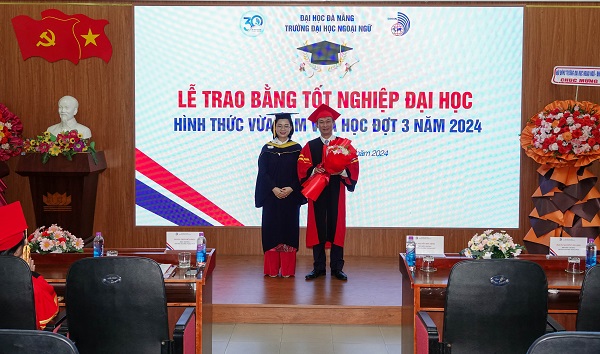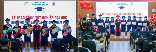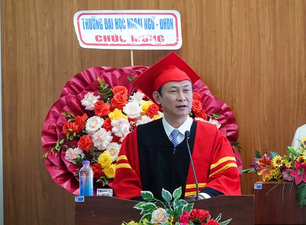 Trong buổi lễ tốt nghiệp, PGS.TS. Trần Hữu Phúc đã chia sẻ về những thành tựu nổi bật mà Trường Đại học Ngoại ngữ đã đạt được trong năm học vừa qua, PGS.TS. Trần Hữu Phúc cũng gửi lời chúc mừng đến 37 tân cử nhân, ghi nhận sự nỗ lực trong suốt quá trình học tập, vượt qua thử thách và hoàn thành khóa học với những kết quả đáng tự hào. Lãnh đạo Nhà trường hy vọng rằng, với những kiến thức và kỹ năng đã tiếp thu, các tân cử nhân sẽ tiếp tục phát huy và gặt hái nhiều thành công trên con đường sự nghiệp. Cũng tại buổi lễ, Nhà trường cũng đã tuyên dương và khen thưởng 10 tân cử nhân đạt thành tích xuất sắc và 12 tân cử nhân đạt kết quả tốt nghiệp loại giỏi.