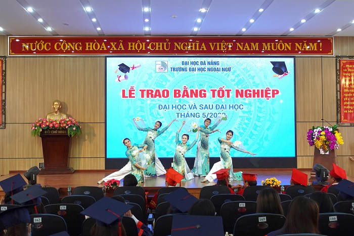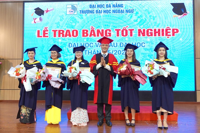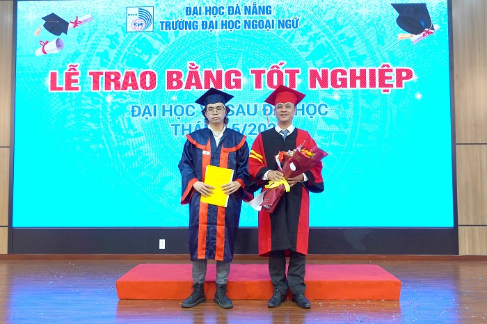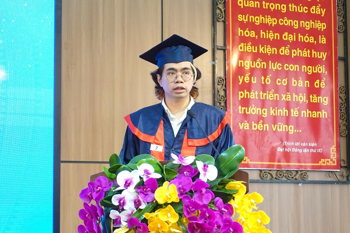 Trong niềm vinh dự và hân hoan, tân cử nhân Trần Kinh Quốc – lớp 17CNACLC, tốt nghiệp loại xuất sắc đã phát biểu, bày tỏ lòng biết ơn sâu sắc đến quý lãnh đạo, cán bộ giảng viên của Nhà trường đã luôn tâm huyết truyền đạt những tri thức, kỹ năng và đồng hành, hỗ trợ sinh viên trong suốt quá trình học tập, rèn luyện, đồng thời hứa “dù ở đâu, trên bất kỳ vị trí công tác nào, chúng em sẽ luôn nỗ lực hết mình để xứng đáng là cựu sinh viên Trường Đại học Ngoại ngữ – ĐHĐN”.