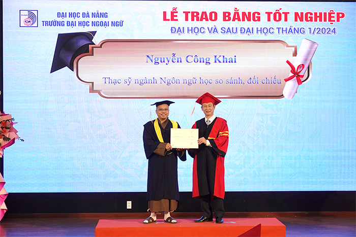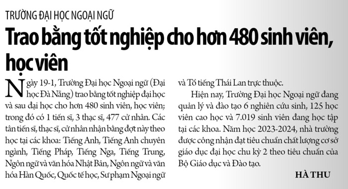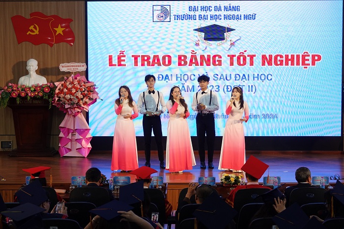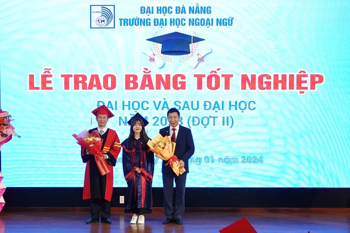 Lễ Trao bằng tốt nghiệp Đại học và Sau đại học đợt 2 năm 2023, Trường Đại học Ngoại ngữ, ĐHĐN có 01 tân tiến sĩ, 03 tân thạc sĩ, 477 tân cử nhân tại các Khoa (Tiếng Anh, Tiếng Anh chuyên ngành, Tiếng Pháp, Tiếng Nga, Tiếng Trung, Ngôn ngữ và Văn hóa Nhật Bản, Ngôn ngữ và Văn hóa Hàn Quốc, Quốc tế học, Sư phạm Ngoại ngữ và Tổ tiếng Thái Lan trực thuộc). Kết quả tốt nghiệp đợt này có 23 tân Cử nhân đạt loại Xuất sắc, 183 tân Cử nhân đạt loại Giỏi. Tại buổi Lễ, các sinh viên đạt kết quả tốt nghiệp loại Xuất sắc và Giỏi đã được tuyên dương khen thưởng.