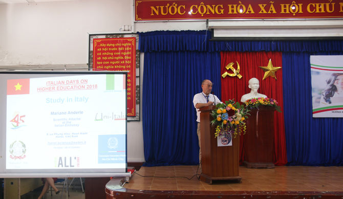 Ông Mariano Anderle – tùy viên Đại sứ quán Ý giới thiệu tổng quan về đại học Ý, về môi trường học tập, điều kiện xét học bổng, chương trình học và văn hóa của đất nước Ý dành cho du học sinh
