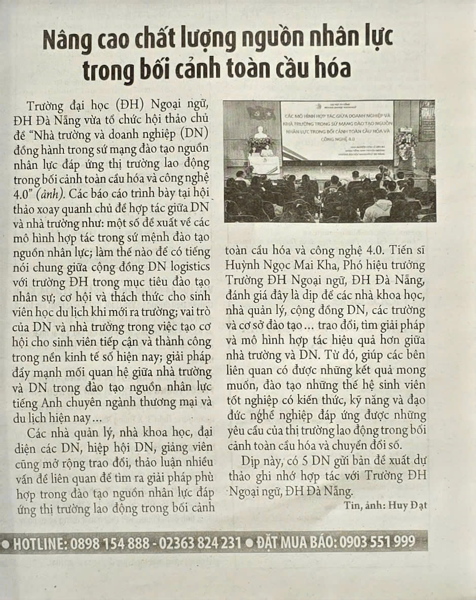 Bên cạnh các báo cáo tham luận được trình bày nhằm tạo diễn đàn trao đổi và thảo luận, Hội thảo cũng mở ra nhiều cơ hội hợp tác giữa Nhà trường và Doanh nghiệp. Được biết, thông qua Hội thảo đã có 5 doanh nghiệp gửi bản đề xuất dự thảo ghi nhớ hợp tác với Trường Đại học Ngoại ngữ, ĐHĐN, gồm Công ty CP Kho vận Liên Chiểu Xanh, Hiệp hội Vận tải Hàng hóa Đường bộ Đà Nẵng, Công ty TNHH Saigon Ship, Công ty TNHH Daiwa Việt Nam và KOI Resort and Residence.