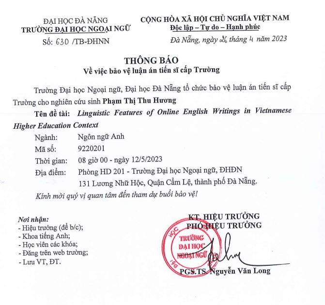 Thông báo bảo vệ luận án tiến sĩ cấp Trường