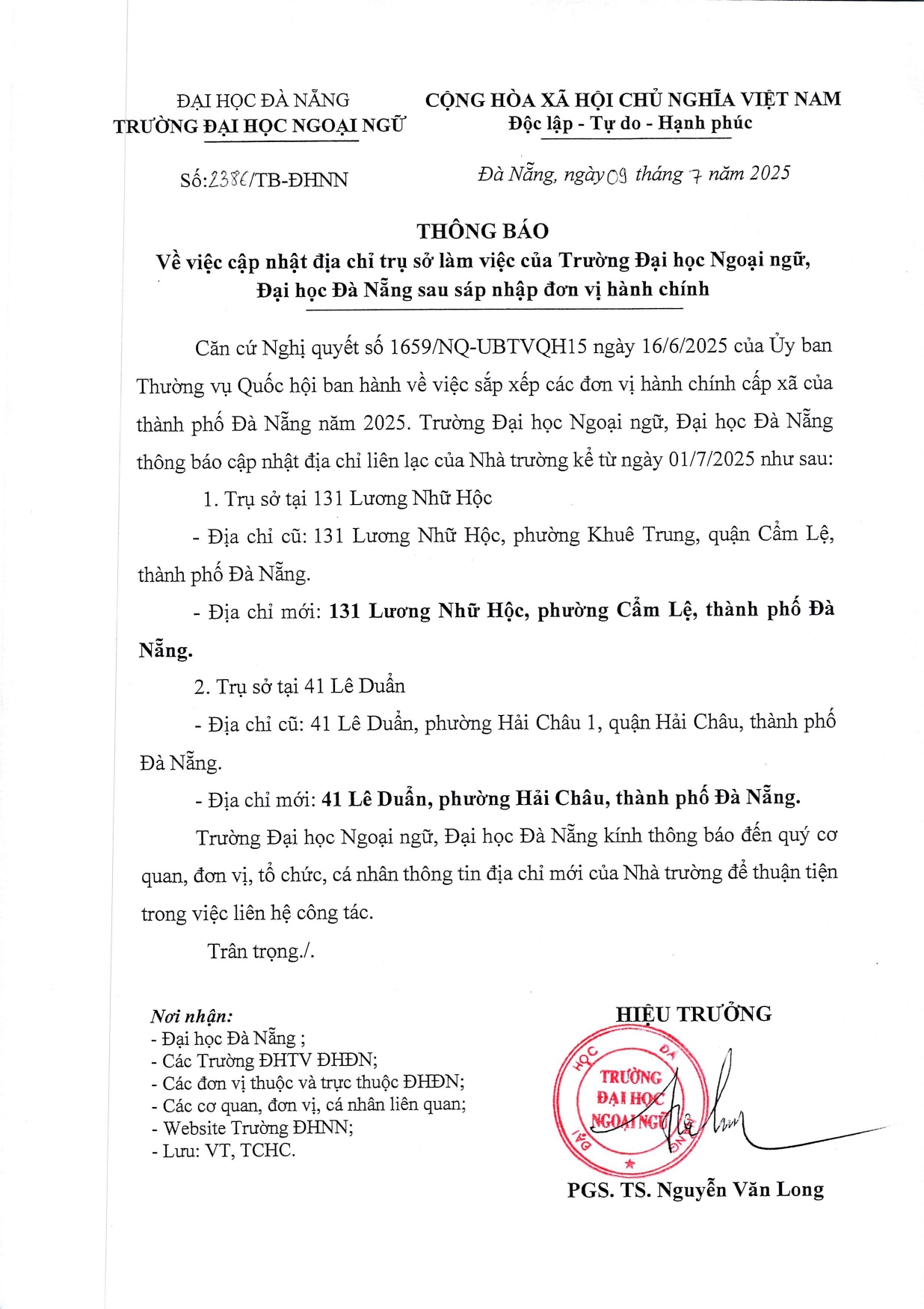 Trang chủ / Notices / Về việc cập nhật địa chỉ trụ sở làm việc của Trường Đại học Ngoại ngữ, Đại học Đà Nẵng
