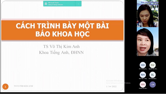 Nhằm tạo điều kiện cho cán bộ, giảng viên Nhà trường nâng cao kỹ năng viết bài báo khoa học, chiều ngày 14/01/2022, Hội thảo trực tuyến “Cách viết bài báo khoa học” do báo cáo viên TS. Võ Thị Kim Anh – Phó trưởng khoa Khoa tiếng Anh, Trường Đại học Ngoại ngữ – Đại học Đà Nẵng trình bày thu hút sự tham dự đông đảo của cán bộ, giảng viên Nhà trường.
