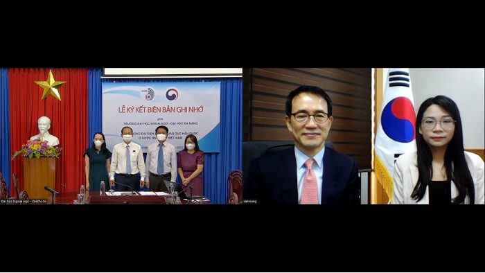 Ngày 24/3/2022 vừa qua, PGS.TS. Trần Hữu Phúc – Hiệu trưởng Trường Đại học Ngoại ngữ – Đại học Đà Nẵng (ĐHĐN) đã tham dự buổi làm việc và ký kết biên bản ghi nhớ hợp tác với ông Won Kwang Seog – Trưởng Văn phòng đại diện Phòng Giáo dục Hàn Quốc ở nước ngoài tại Việt Nam. Cùng tham dự có lãnh đạo Phòng Khoa học và Hợp tác Quốc tế, Khoa Ngôn ngữ và Văn hóa Hàn Quốc. Buổi làm việc và ký kết được diễn ra theo hình thức trực tuyến.
