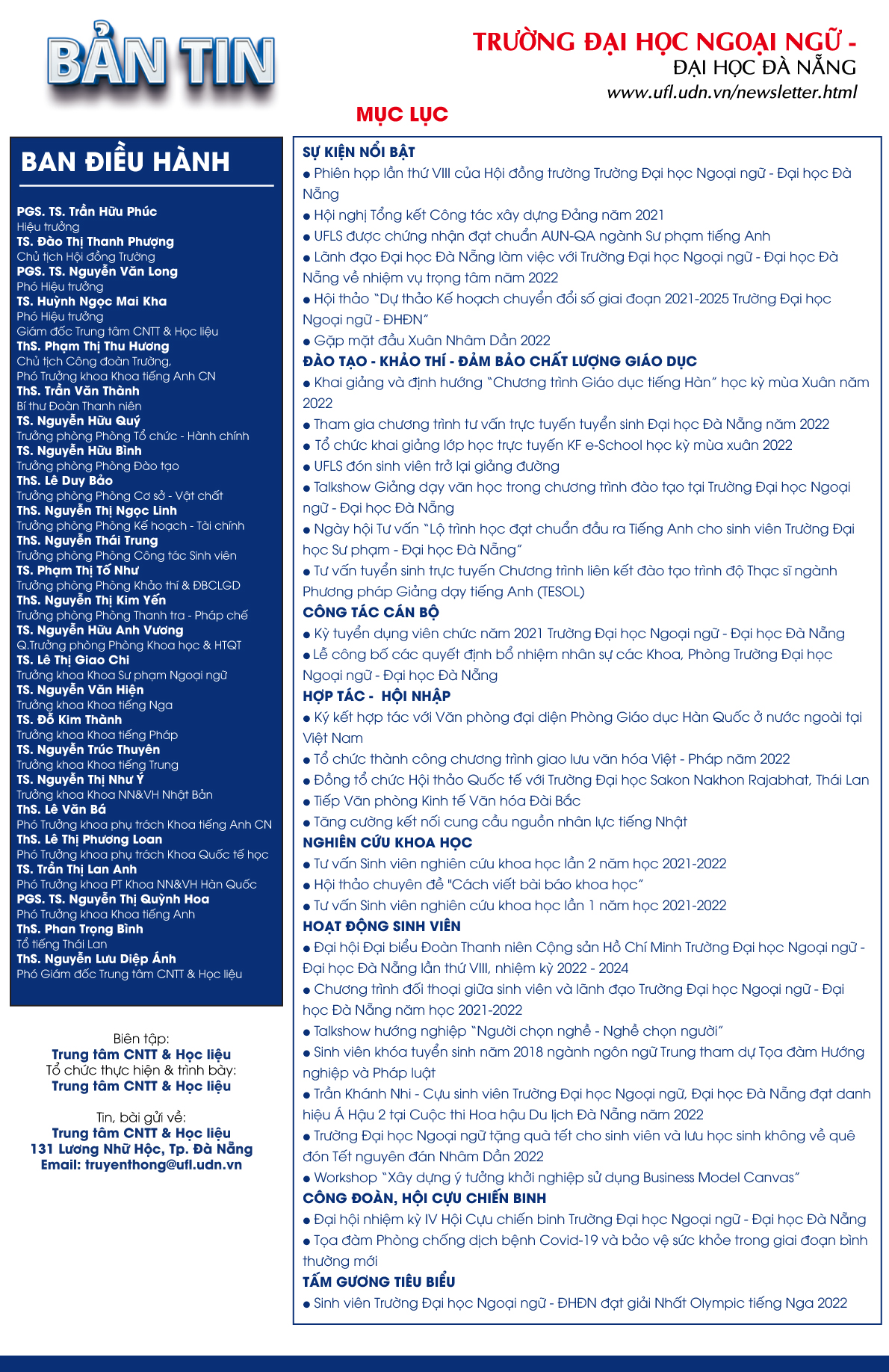 Hòa chung không khí đón xuân của cả nước, sáng ngày 07/2/2022 (tức Mùng 7 Tết), Trường Đại học Ngoại ngữ – Đại học Đà Nẵng tổ chức buổi gặp mặt đầu Xuân Nhâm Dần 2022 và vinh danh các tân Tiến sĩ, Thạc sĩ năm 2021. Đây là hoạt động thường niên và đã trở thành truyền thống tốt đẹp của Nhà trường mỗi độ xuân về.