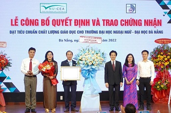 Sáng ngày 14/9/2022, Trường Đại học Ngoại ngữ – Đại học Đà Nẵng phối hợp với Trung tâm Kiểm định Chất lượng Giáo dục (KĐCLGD) – Đại học Quốc gia Hà Nội long trọng tổ chức Lễ công bố quyết định và trao Chứng chận đạt tiêu chuẩn chất lượng cơ sở giáo dục đại học cho Trường Đại học Ngoại ngữ – ĐHĐN.