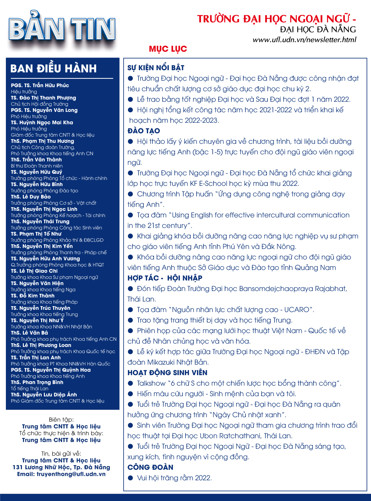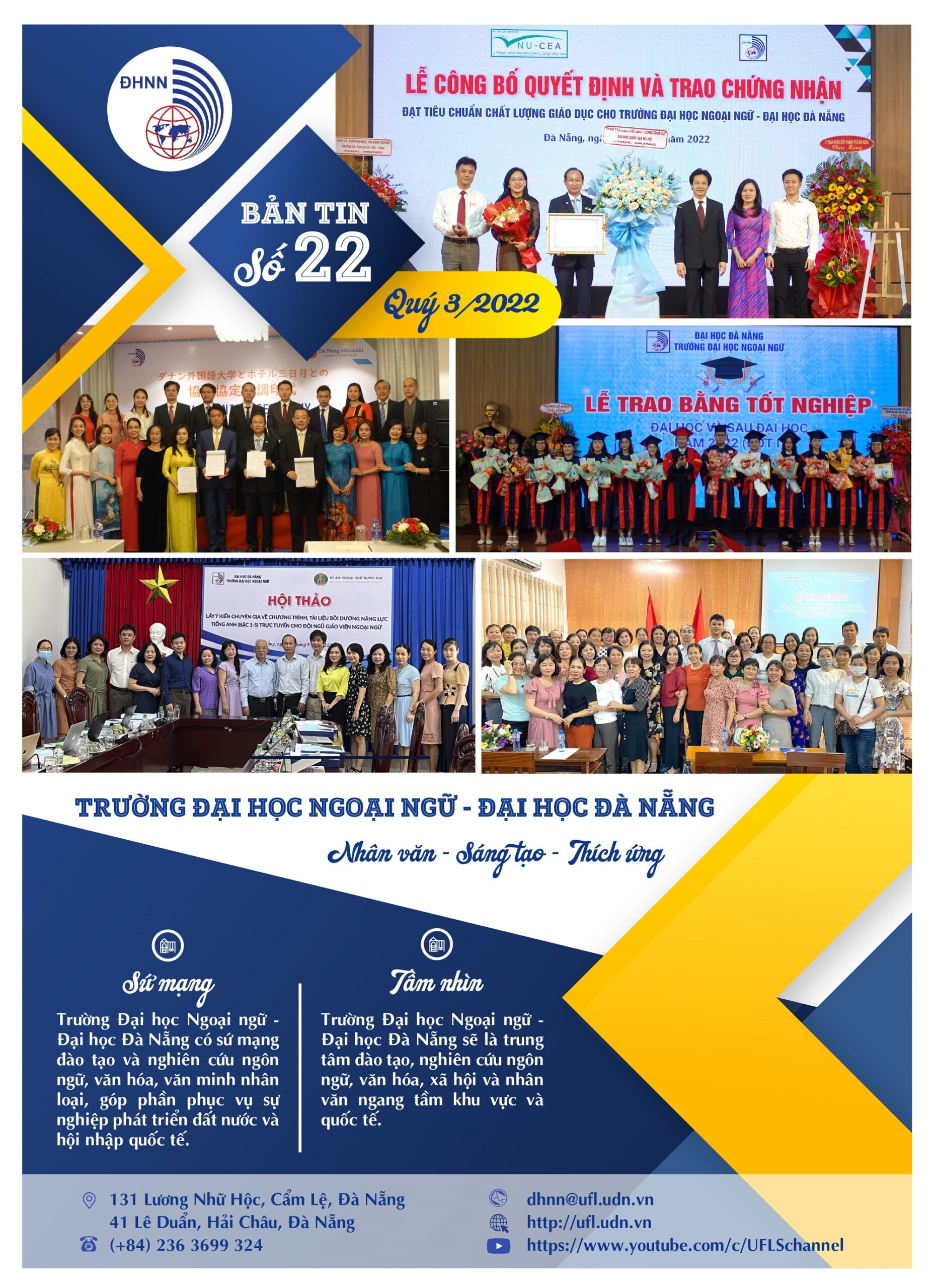 Ngày 12/8/2022, Trường Đại học Ngoại Ngữ – Đại học Đà Nẵng đã long trọng tổ chức Lễ trao bằng tốt nghiệp Đại học và Sau đại học đợt 1 năm 2022 cho hơn 749 tân cử nhân và 03 tân tiến sĩ. Trong đợt này có 733 sinh viên đại học chính quy, 13 học viên hệ vừa học vừa làm và 3 tiến sĩ ngành ngôn ngữ Anh.