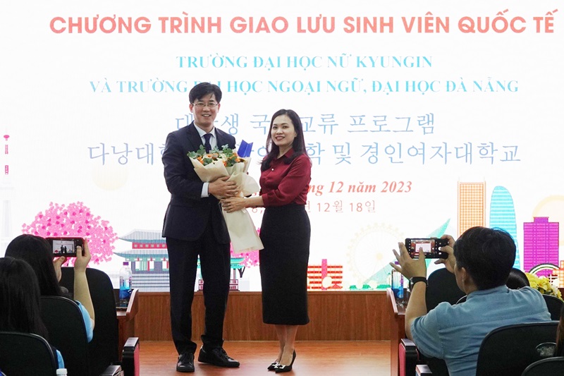 Phát biểu khai mạc Chương trình giao lưu, TS. Huỳnh Ngọc Mai Kha chào mừng đoàn Trường Đại học nữ Kyungin đến giao lưu tại Trường Đại học Ngoại ngữ, ĐHĐN. Bày tỏ niềm vui đón tiếp, Phó Hiệu trưởng hy vọng Nhà trường là điểm đến đáng tin cậy để sinh viên Hàn Quốc nói chung và sinh viên Trường Đại học nữ Kyungin đến giao lưu và tìm hiểu văn hóa Việt Nam.