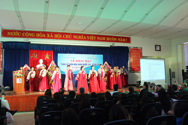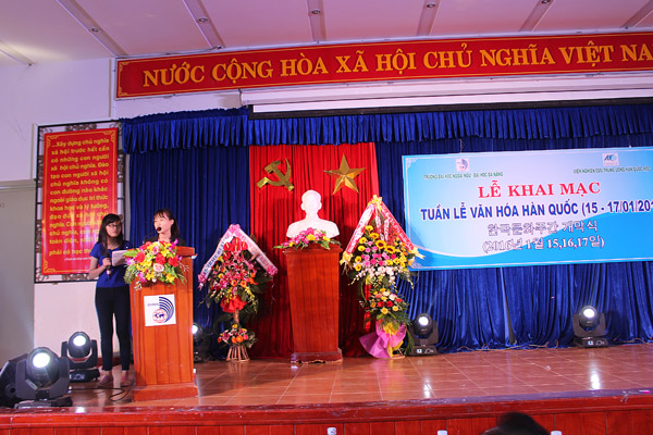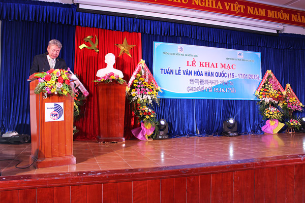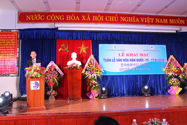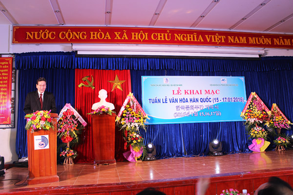 Phát biểu khai mạc, TS. Trần Hữu Phúc – Hiệu trưởng Nhà trường chia sẻ: “Nhằm giúp cho sinh viên có thêm nhiều cơ hội được tiếp xúc, giao lưu với các sinh viên, giáo viên người Hàn và có cơ hội du học trao đổi ở các trường đại học ở Hàn Quốc, Trường ĐHNN đã tiến hành kí kết hợp tác với rất nhiều các trường Đại học của Hàn Quốc như Kookmin, Myongji, Chung Ang… Một trong những hoạt động tiêu biểu là Nhà trường đã phối hợp với Viện Nghiên cứu Trung ương Hàn Quốc học triển khai Dự án Ươm mầm ngành Hàn Quốc từ năm 2014. Trong suốt quá trình triển khai, dự án đã tổ chức nhiều hoạt động học thuật và nghiên cứu đạt hiệu quả, giúp sinh viên ngành tiếng Hàn Trường Đại học Ngoại ngữ có thêm những kiến thức phong phú về văn hoá, ngôn ngữ; được tiếp xúc với các trò chơi dân gian, các loại hình dân ca truyền thống của Hàn Quốc. Năm nay, Dự án cũng đã tổ chức các lớp học tập, lớp dân ca, nông nhạc, lớp trò chơi dân gian và lớp ẩm thực Hàn Quốc. Năm nay dự án cũng đã mở thêm lớp du lịch phù hợp với nhu cầu của các sinh viên học tiếng Hàn tại thành phố du lịch Đà Nẵng. Dự án năm nay cũng tổ chức sự kiện tuần lễ văn hoá Hàn diễn ra từ ngày 15-17/01/2016 với nhiều hoạt động phong phú như lễ hội ẩm thực, biểu diễn kpop. Đặc biệt trong chuỗi hoạt động tuần lễ văn hóa năm nay Dự án có tổ chức buổi báo cáo học thuật chuyên đề với sự tham gia của các giáo sư đến từ các trường đại học danh tiếng Hàn quốc, các giáo sư và sinh viên tiếng Hàn của các trường Đại học Huế và Đà Lạt và buổi báo cáo học thuật chuyên đề năm nay hứa hẹn sẽ là cơ hội hữu ích để các giáo sư, sinh viên có thể trao đổi kiến thức về ngôn ngữ và văn hóa Hàn Quốc.”