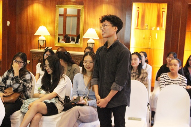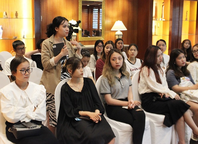 Sau khi tham quan, đoàn sinh viên tập trung tại Hội trường để tham dự buổi giới thiệu tổng quan về Furama Resort Danang, chính sách quản lý nhân sự và cơ hội thực tập dành cho sinh viên cũng như tìm kiếm các vị trí việc làm sau khi ra trường. Sau phần giới thiệu chi tiết và đầy đủ của bà Nguyễn Thị Thanh Nhường, đoàn sinh viên hứng khởi đặt những câu hỏi trao đổi, thảo luận để tìm hiểu cụ thể hơn về cơ cấu tổ chức, chính sách quản lý, thái độ phục vụ, chăm sóc của Furama Resort Danang.