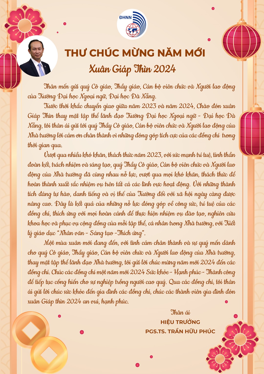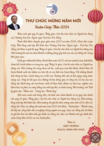 Trang chủ / Tin tức / Thư Chúc mừng Năm mới 2024 của Thầy Hiệu trưởng Trường Đại học Ngoại ngữ, ĐHĐN gửi quý Cô giáo, Thầy giáo, Cán bộ viên chức và Người lao động