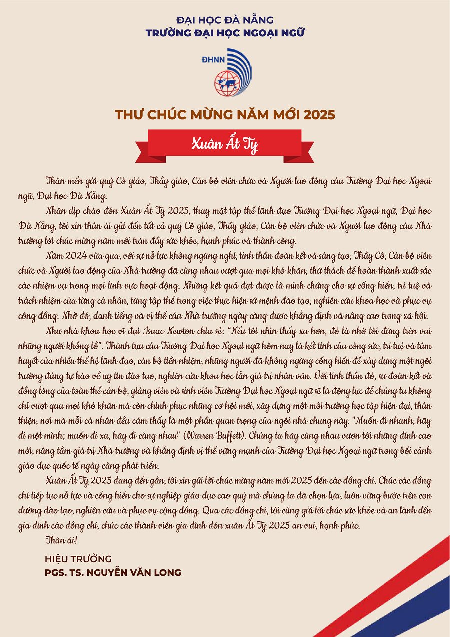 Trang chủ / Tin tức / Thư Chúc mừng Năm mới 2025 của Thầy Hiệu trưởng Trường Đại học Ngoại ngữ, ĐHĐN gửi quý Cô giáo, Thầy giáo, Cán bộ viên chức và Người lao động
