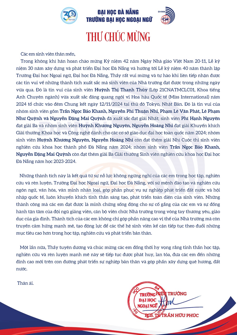 Thư chúc mừng từ Thầy Hiệu trưởng Trường Đại học Ngoại ngữ, Đại học Đà Nẵng