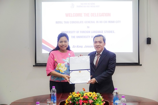 Nhân dịp này, Bà Wiraka Moodhitaporn đã trao tặng “Giải thưởng Lãnh sự tình nguyện năm 2024” của Bộ Ngoại giao Thái Lan cho ThS. Phan Trọng Bình, cán bộ quản lý điều hành Tổ Tiếng Thái Lan, nhằm ghi nhận những đóng góp xuất sắc trong công tác lãnh sự. Đây là giải thưởng dành cho người Thái Lan hoặc người nước ngoài có những đóng góp tích cực trong công tác lãnh sự, công tác phục vụ cộng đồng, hỗ trợ người Thái ở nước ngoài. Giải thưởng không chỉ vinh danh cá nhân ThS. Phan Trọng Bình, viên chức của Nhà trường, mà còn khẳng định sự hợp tác tốt đẹp giữa Tổng Lãnh sự quán Hoàng gia Thái Lan tại Tp. HCM và Trường Đại học Ngoại ngữ, Đại học Đà Nẵng.