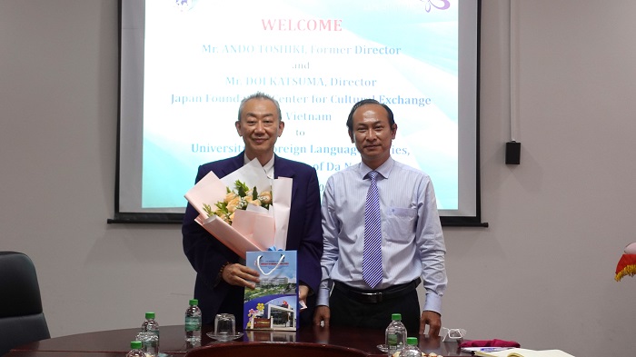 Thay mặt Trường Đại học Ngoại ngữ – Đại học Đà Nẵng, Hiệu trưởng Trần Hữu Phúc gửi lời cảm ơn ông ANDO Toshiki và Trung tâm Giao lưu Văn hóa Nhật Bản tại Việt Nam đã luôn tích cực hỗ trợ Trường Đại học Ngoại ngữ rất nhiều hoạt động trong thời gian qua. chúc ông ANDO Toshiki sẽ tiếp tục gặt hái được thật nhiều thành công và thuận lợi ở vị trí công tác mới và mong ông sẽ dành thời gian để trở lại thăm Trường Đại Học Ngoại ngữ. Với vị trí là tân Giám đốc Trung tâm Giao lưu Văn hóa Nhật Bản tại Việt Nam, ông DOI Katsuma mong muốn hai bên cùng nỗ lực cố gắng để giữ gìn, phát triển mối quan hệ ngày càng tốt đẹp hơn.